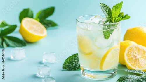 Refreshing Cold lemonade in a glass with ice cubes and fresh mint leaves.