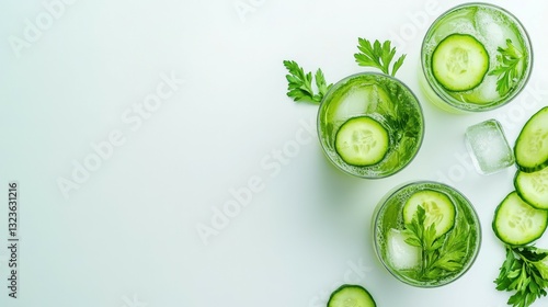 Refreshing Cucumber Infusion: A top-down shot showcases three glasses filled with refreshing cucumber-infused water, garnished with parsley and ice cubes. The cool.