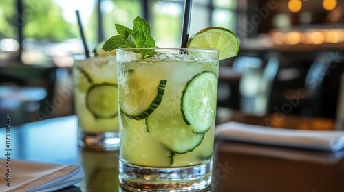 Refreshing cucumber lime mint lemonade served in stylish glasses on a wooden table in a bright, inviting setting