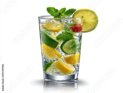 Refreshing drink with citrus and mint isolated on white background. use cases: beverage, cocktail.