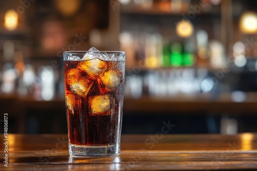 Refreshing fizzy drink in a glass with ice cubes on a wooden table in a bar setting, perfect for illustrating beverages and nightlife themes.