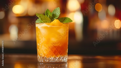 Refreshing fresh orange juice with mint garnish served in a stylish glass at a vibrant bar in the evening