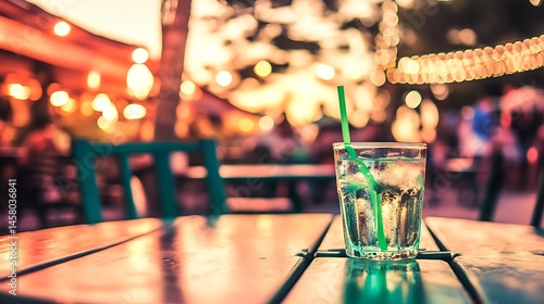 Refreshing glass of ice water with straw on an outdoor cafe table scene