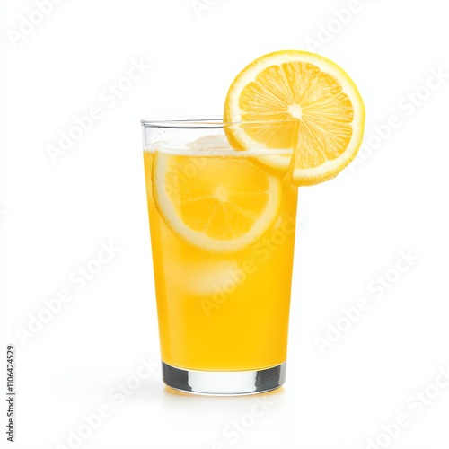 Refreshing glass of lemonade with ice and lemon slices, perfect for summer days. Bright colors and vibrant presentation make it ideal for beverage advertisements and food blogs.