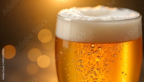 Refreshing golden beer with crisp white foam and effervescent bubbles in a glass, perfect for celebrations