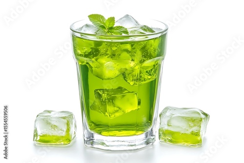 Refreshing green drink with ice and mint on white background.