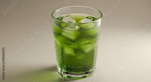 Refreshing Green Drink with Ice Cubes in a Glass on Bright Background