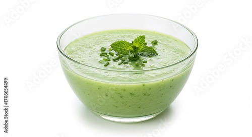 Refreshing green soup gently rests in a clear bowl garnished with fresh herbs. AI Generated