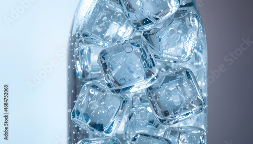 Refreshing ice cubes floating in a glass bottle creating a cool and crisp sensation