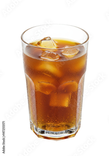 Refreshing iced beverage in clear glass with ice cubes on black background - cool and thirst-quenching