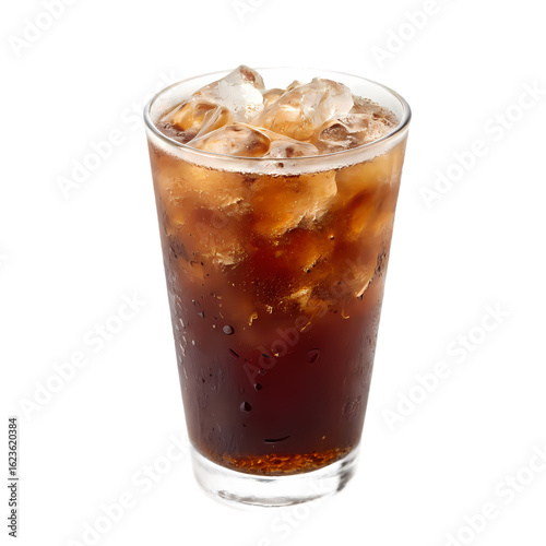 Refreshing iced coffee drink with ice cubes in a tall glass on black background