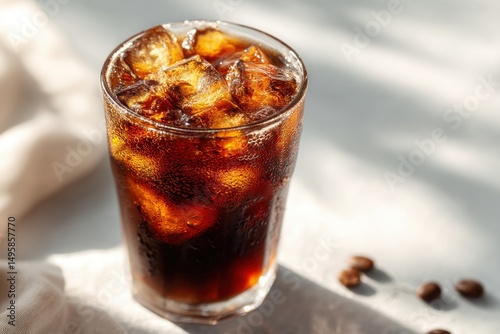 Refreshing iced coffee in a glass with ice cubes and coffee beans on white cloth, close up shot, delicious summer beverage with cold brew coffee.