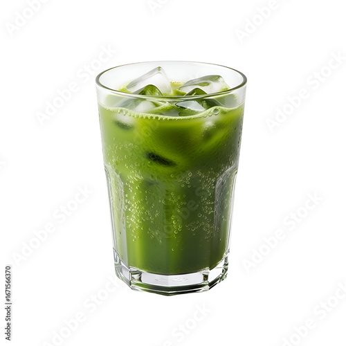 Refreshing Iced Matcha Latte in Glass on White Background.