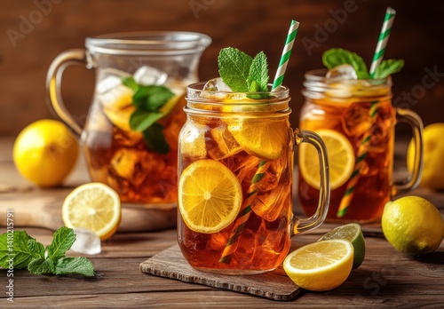 Refreshing Iced Tea with Lemon and Mint Leaves in Mason Jars Served on a Wooden Surface Perfect for Summer Gatherings and Refreshment Ideas