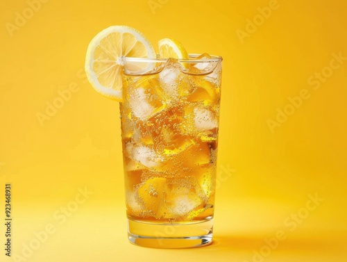 Refreshing iced tea with lemon slices and mint served in a glass against a vibrant yellow background
