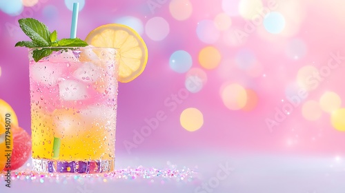 Refreshing lemonade drink with lemon and mint in a glass, ice cubes, on pink bokeh background.