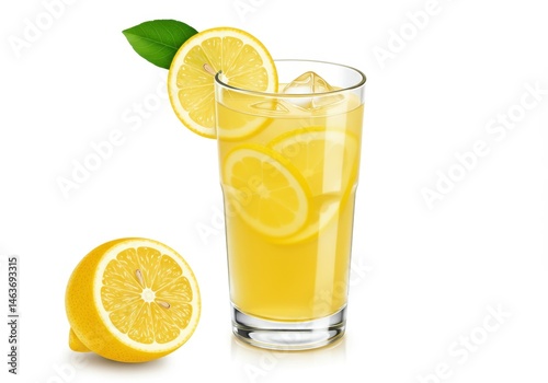Refreshing lemonade in glass with lemon slices and a half lemon on white background