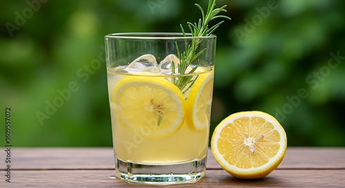 Refreshing lemonade with lemon slices, ice, and rosemary on a wooden table outdoors