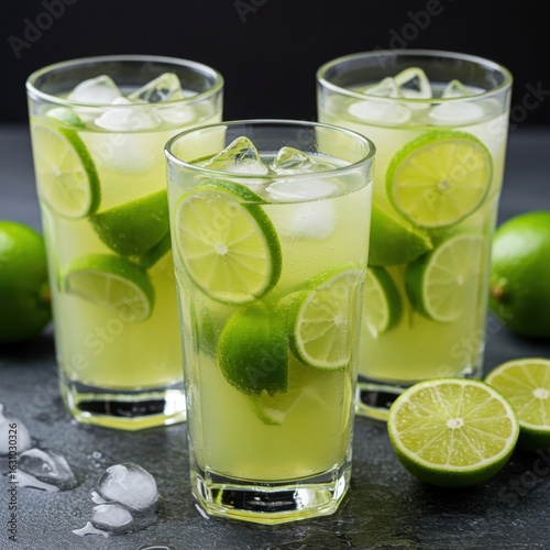 Refreshing lime cocktails with ice and fresh lime slices on a dark surface