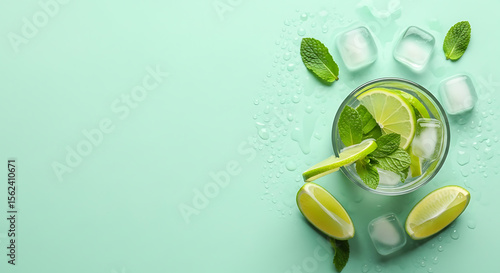 Refreshing Lime Mint Drink with Ice and Macarons on Green Background