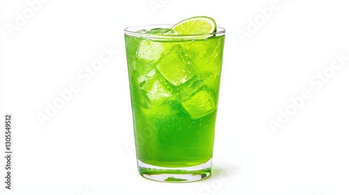 Refreshing Lime Soda in a Glass with Ice and Slices of Lime on White Background