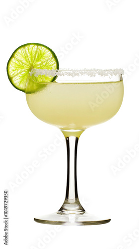 Refreshing margarita cocktail served in a stylish glass with a lime slice on a white isolated background. Transparent Background