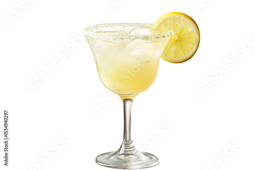 Refreshing margarita served in a glass with a lemon slice on a transparent background, highlighting the drink's vibrant color and icy texture