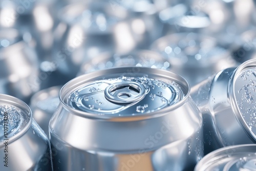 Refreshing metallic beverage cans with condensation on blue bokeh background