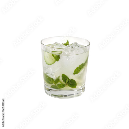 Refreshing mojito cocktail is served in a glass with ice cubes and fresh mint leaves against transparent background.