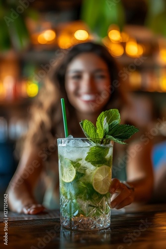 Refreshing Mojito on a Bar Counter with a Smiling Woman in Background