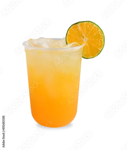 Refreshing Natural Squeezed Orange Juice with Ice and Lime Garnish in a Plain Plastic Cup on a White Background