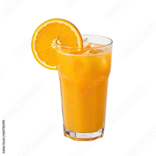 Refreshing orange juice in a tall glass with orange slice isolated on transparent background