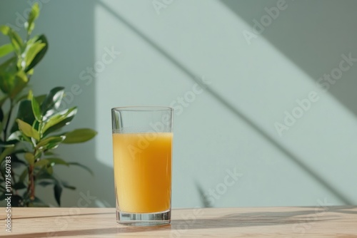 Refreshing orange juice served in a clear glass on a wooden table with natural light and greenery in the background