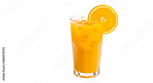 Refreshing orange juice served in a clear glass with ice and a slice of orange