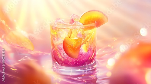 Refreshing Peach Cocktail with Ice and Sparkling Vivid Background