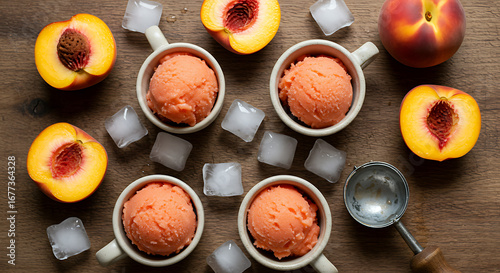 Refreshing Peach Ice Cream Scoops Surrounded by Fresh Peaches and Ice Cubes on a Wood Surface