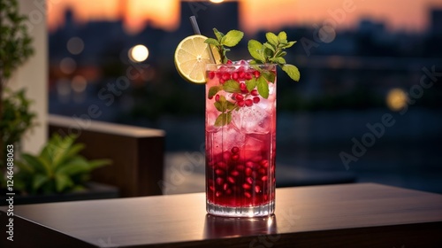 Refreshing pomegranate mojito cocktail with mint and lemon, a vibrant drink concept for summer menus, party promotions, or bar advertisements.