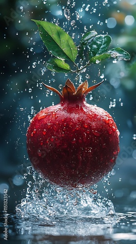 Refreshing Pomegranate Plunging into Sparkling Water with Floating Leaves