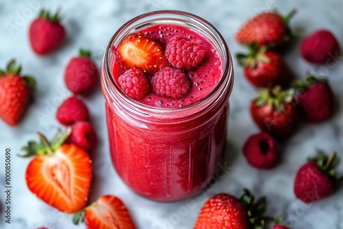 Refreshing red smoothie in a glass jar surrounded by fresh strawberries and raspberries