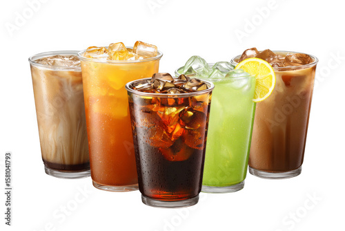 Refreshing Set of Cold Drinks in Clear Cups Featuring Iced Tea and Smoothies Perfect for Summer Enjoyment