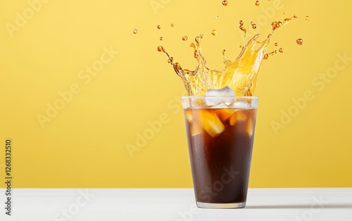 Refreshing Splash of Iced Drink Against Yellow Backdrop