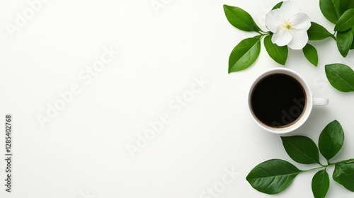 Refreshing still life aromatic coffee and vibrant green leaves on white background