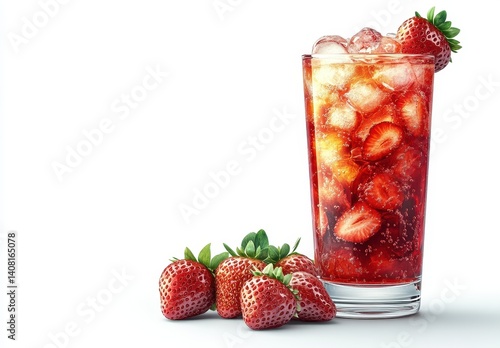 Refreshing Strawberry Beverage with Ice Cubes in Glass on White Background Ideal for Summer Drinks, Healthy Lifestyle, or Fruit-Based Recipes Photography