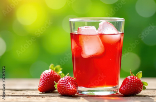 Refreshing strawberry juice with ice on wooden table in sunlit garden scene