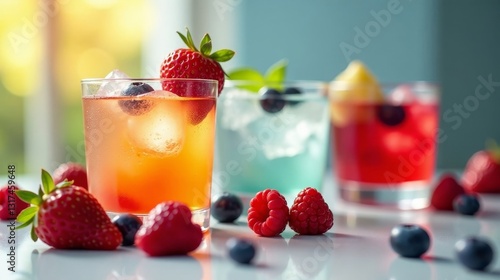 Refreshing Summer Berry Iced Drinks with Ice Cubes and Fresh Fruit Garnish