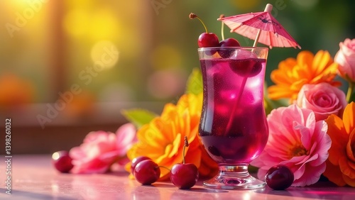Refreshing summer cocktail garnished with cherries and a tiny umbrella, surrounded by vibrant flowers in a sunlit setting.