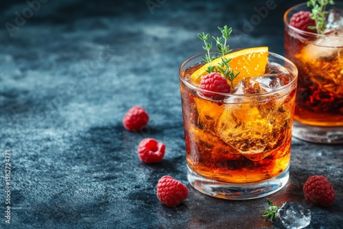 Refreshing summer cocktails with berries and citrus on dark stone surface