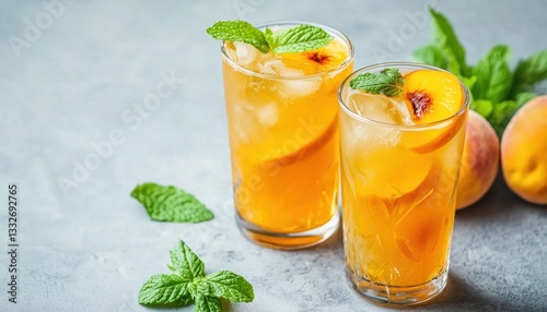 Refreshing Summer Drink Recipe: Ice Peach Tea Or Cocktail With Mint And Apricots. Peach Lemonade In Two Glasses On A Light Table.