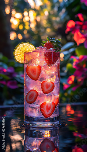 Refreshing summer drinks with fresh strawberries, lime slices, and ice, served in clear cups against a vibrant outdoor background