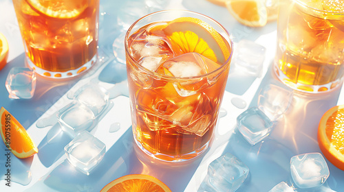 Refreshing summer drinks with orange slices and ice cubes on a blue surface.